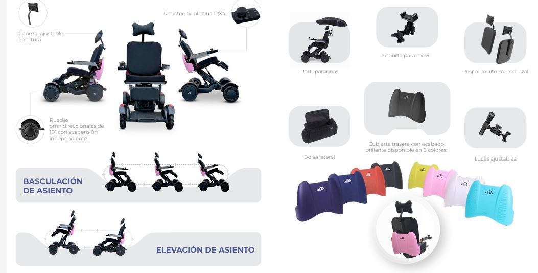 La nueva silla M4-H es la modernización de la M4. Nuestra M4 cumple con la normativa Sanitaria, con repuestos originales y servicio técnico en España Respaldo Alto de serie, con reposacabezas. Con 2 Carcasas de regalo, la Negra y la del color que más te guste. Su asiento cuenta con regulación en altura eléctrica, lo que hace que el usuario se sitúe en una altura perfecta según sus necesidades: colocarse en un escritorio, sociabilizar, o simplemente por la fisionomía de la persona. Uno de los elementos más diferenciales de la XSTO M4 es su sistema de balance inteligente. A través de sensores de postura y algoritmos de control autónomo, la silla analiza en tiempo real la inclinación del terreno y ajusta automáticamente la posición del asiento. Respaldo Alto y reposacabezas incluido. Subida de pendientes: el sistema extiende el actuador trasero para mantener el asiento prácticamente paralelo al suelo, mejorando la estabilidad y reduciendo la sensación de inclinación. Descenso de pendientes: el actuador se contrae de forma progresiva, manteniendo una postura segura y confortable para el usuario. Este sistema permite superar pendientes de hasta 15º, cruzar pequeños obstáculos y desplazarse con total confianza, sin derrapes ni movimientos bruscos. La silla de ruedas eléctrica Dinamic és totalmente plegable, lo que la hace perfecta para viajar y guardarla cómodamente cuando lo la uses. Se pliega mediante un botón, con un solo toque. También se desmonta en 3 partes diferentes: asiento, chasis con ruedas traseras y ruedas delanteras. Su batería es extraíble. ¡Es muy cómoda de guardar en el maletero de un coche!