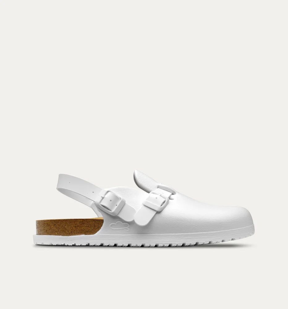 Su horma anatómica permite andar de manera ergonómica y cómoda. Correa con hebilla ajustable en el talón y en el empeine para ajustarse al pie del usuario. Cada zueco pesa solo 200 gramos. Diseño silencioso, flexible, antibacteriano y antideslizante. Plantillas anatómicas de corcho natural incluidas.
